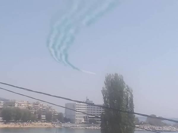 Το σμήνος της Βασιλικής Πολεμικής Αεροπορίας πέταξε πάνω από την πόλη με προορισμό την Ουγγαρία για άσκηση, ενώ δεν παρέλειψαν να… χαιρετήσουν τους Καβαλιώτες, αφήνοντας πίσω τους πολύχρωμους καπνούς, δημιουγώντας ένα εντυπωσιακό θέαμα.