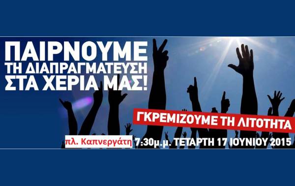 Καλούμε όλους τους πολίτες στην συγκέντρωση αντίστασης στους εκβιασμούς των δανειστών, την Τετάρτη 17/6, στις 7.30 το απόγευμα, στην πλατεία Καπνεργάτη.