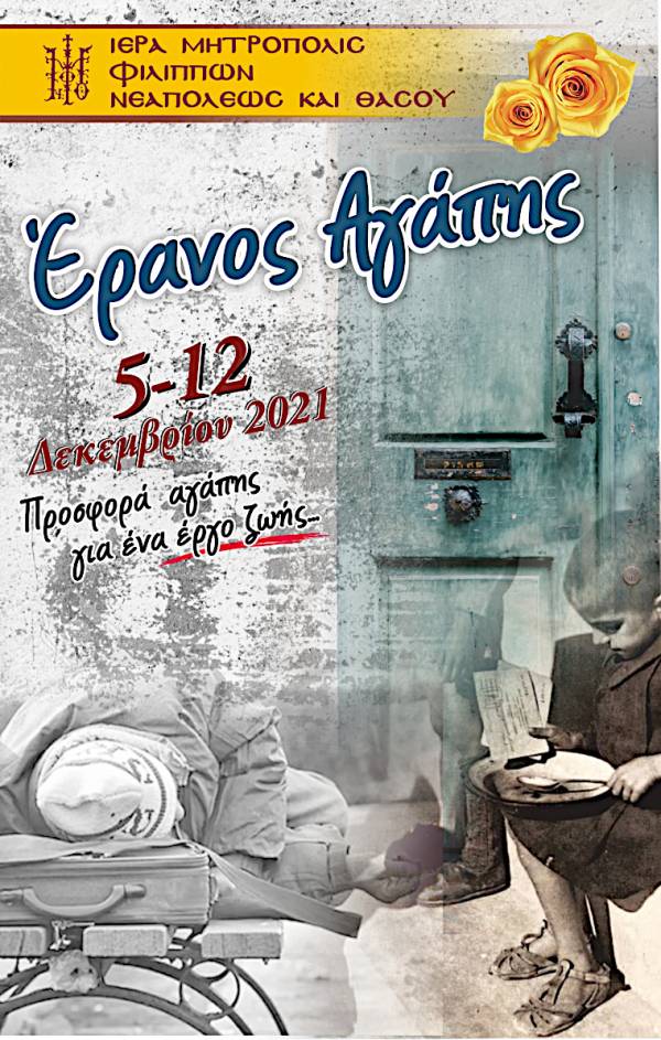 Σᾶς προσκαλοῦμε, σᾶς παρακαλοῦμε καὶ σᾶς προτρέπομε νὰ ἐνισχύσωμε ὅλοι μαζύ, τὴν προσπάθειά μας γιὰ τὸν ΕΡΑΝΟ ΤΗΣ ΑΓΑΠΗΣ, μέσα στὶς ἐκκλησίες μας λόγῳ τῶν ἐπικρατούντων καὶ τηρουμένων ἀπαρεγκλίτως μέτρων γιὰ τὴν πανδημία, καὶ ποὺ ἐφέτος θὰ πραγματοποιηθῇ ΑΠΟ ΤΙΣ 5 ΕΩΣ ΤΙΣ 12 ΔΕΚΕΜΒΡΙΟΥ 2021.