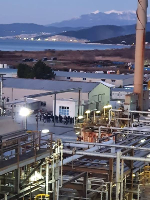 Οι εργαζόμενοι αυτή την ώρα έχουν ανέβει στον πύργο ελέγχου με τα ΜΑΤ από κάτω τα οποία διευκολύνουν την παραμονή των εκπροσώπων εταιρείας μέσα στο εργοστάσιο.