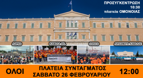 Σε αυτό το πλαίσιο, η αγωνία των εργαζομένων του δευτερογενή τομέα γίνεται ΑΓΩΝΑΣ ενάντια σε διαλυτικές κυβερνητικές αποφάσεις, παράνομες και καταχρηστικές εργοδοτικές πρακτικές. Οι Ομοσπονδίες και τα Σωματεία των κλάδων της Ενέργειας, του Μετάλλου και της Χημικής Βιομηχανίας απευθύνουν ευρύ κάλεσμα στον κόσμο της μισθωτής εργασίας, σε όλες τις υγιείς κοινωνικές δυνάμεις και τους ενεργούς πολίτες να συμμετέχουν στη μεγάλη αγωνιστική κινητοποίηση που διοργανώνουν το Σάββατο 26 Φεβρουαρίου με προσυγκέντρωση στις 10:30 π.μ. Ομόνοια και πορεία στο Σύνταγμα όπου θα πραγματοποιηθεί μαζικό Συλλαλητήριο στις 12:00».