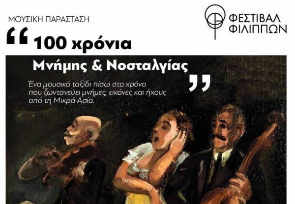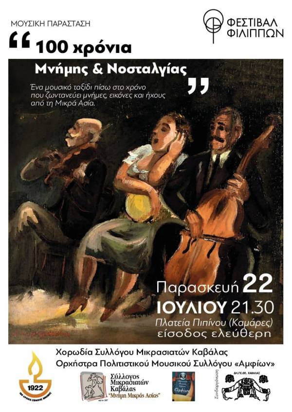 Στο πλαίσιο των παράλληλων εκδηλώσεων του 65ου Φεστιβάλ Φιλίππων η πολυμελής χορωδία του  Συλλόγου Μικρασιατών Καβάλας «Μνήμη Μικράς Ασίας» υπό την Διεύθυνση του χοράρχη κ. Απόστολου Αθιανού και η ορχήστρα του Πολιτιστικού Μουσικού Συλλόγου «Αμφίων» υπό την διεύθυνση του κ. Μανώλη Παργιεντάκη σε συνεργασία με το ΔΗ.ΠΕ.ΘΕ. Καβάλας, παρουσιάζουν την Παρασκευή 22 Ιουλίου στις 9.30 το βράδυ, στην Πλατεία Πιπίνου (Καμάρες) τη μουσική παράσταση «Εκατό χρόνια μνήμης και νοσταλγίας».