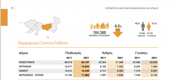 Η μεγαλύτερη μείωση πληθυσμού στην Περιφέρεια ΑΜΘ καταγράφεται στην Περιφερειακή Ενότητα Δράμας με 11,9% σε σχέση με το 2011. Η μικρότερη μείωση παρατηρείται στην Ξάνθη που καταγράφει μείωση του πληθυσμού μόλις κατά 2,7% σε σχέση με το 2011.