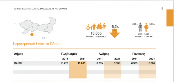 Στην περιφερειακή ενότητα Θάσου η μείωση του πληθυσμού ανέρχεται στο 5,2% σε σχέση με την απογραφή του 2011.