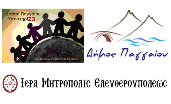 Η Δράση Παγγαίου ΥποστηρίΖΩ με τη συνεργασία του Δήμου Παγγαίου και την υποστήριξη της Ιεράς Μητροπόλεως Ελευθερουπόλεως στην προσπάθειά τους να βοηθήσουν τους πρόσφυγες συνανθρώπους μας, οι οποίοι αναγκάστηκαν να εγκαταλείψουν τις εστίες τους και να πάρουν το δύσκολο δρόμο της προσφυγιάς, συγκεντρώνουν διάφορα είδη τα οποία τους είναι απαραίτητα.