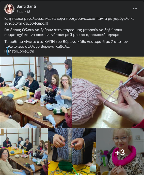 Τα μαθήματα πλεξίματος με βελονάκι από τον πολιτιστικό σύλλογο Βύρωνα Καβάλας  «Η Μεταμόρφωση» συνεχίζονται, κάθε Δευτέρα 6-7 στα ΚΑΠΗ του Βύρωνα.