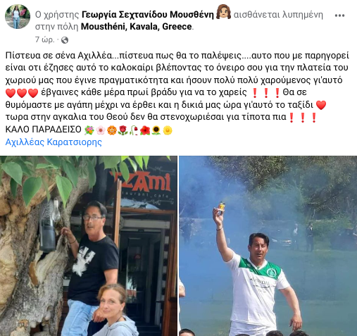 Πίστευα σε σένα Αχιλλέα...πίστευα πως θα το παλέψεις....αυτό που με παρηγορεί είναι ότι έζησες αυτό το καλοκαίρι βλέποντας το όνειρο σου για την πλατεία του χωριού μας που έγινε πραγματικότητα και ήσουν πολύ πολύ χαρούμενος, γι'αυτό έβγαινες κάθε μέρα πρωί βράδυ για να το χαρείς!!! Θα σε θυμόμαστε με αγάπη μέχρι να έρθει και η δική μας ώρα γι αυτό το ταξίδι. Tώρα στην αγκαλιά του Θεού δεν θα στεναχωριέσαι για τίποτα πια!!!