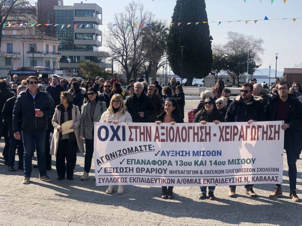 Οι εκπαιδευτικοί γύρω στις 11:00 το πρωί συγκεντρώθηκαν στην κεντρική πλατεία της Καβάλας διαμαρτυρόμενοι για την αξιολόγηση που προωθεί το Υπουργείο Παιδείας.