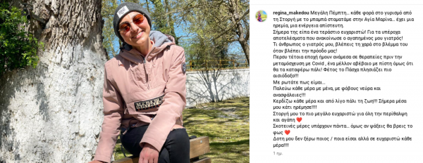 Δότη μου δεν ξέρω ποιος/ποια είσαι, αλλά σε ευχαριστώ κάθε μέρα!!!» έγραψε η Ρεγγίνα Μακέδου στον προσωπικό της λογαριασμό στο Instagram.