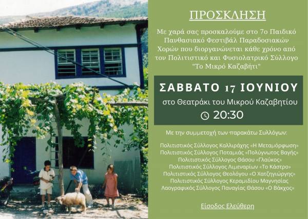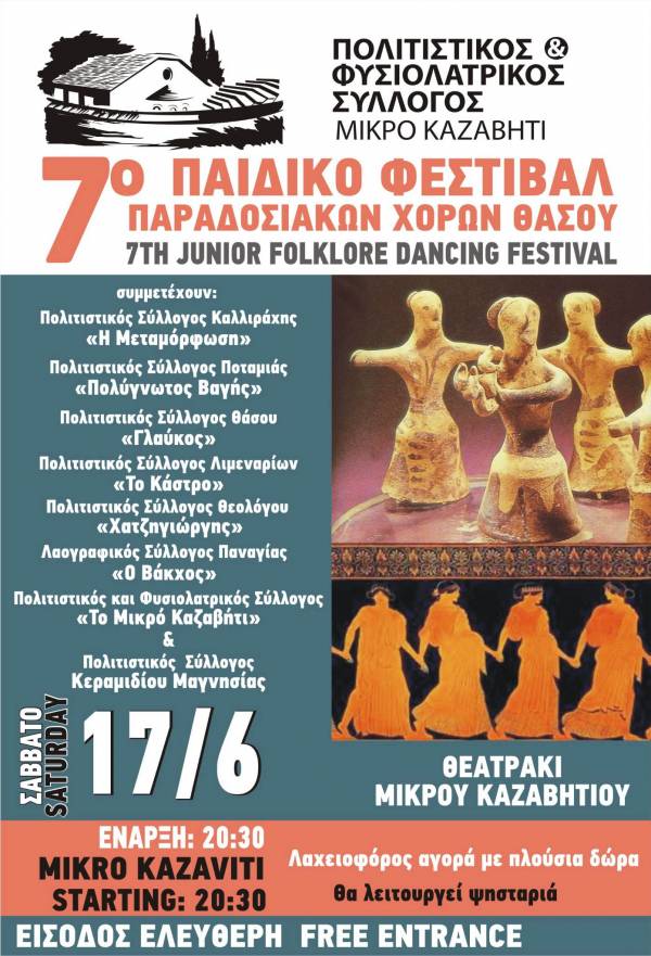 Το Σάββατο 17 Ιουνίου στις 20:30 το βράδυ, θα διεξαχθεί στο θεατράκι του Μικρού Καζαβητίου το 7ο Παιδικό Φεστιβάλ παραδοσιακών χορών Θάσου.