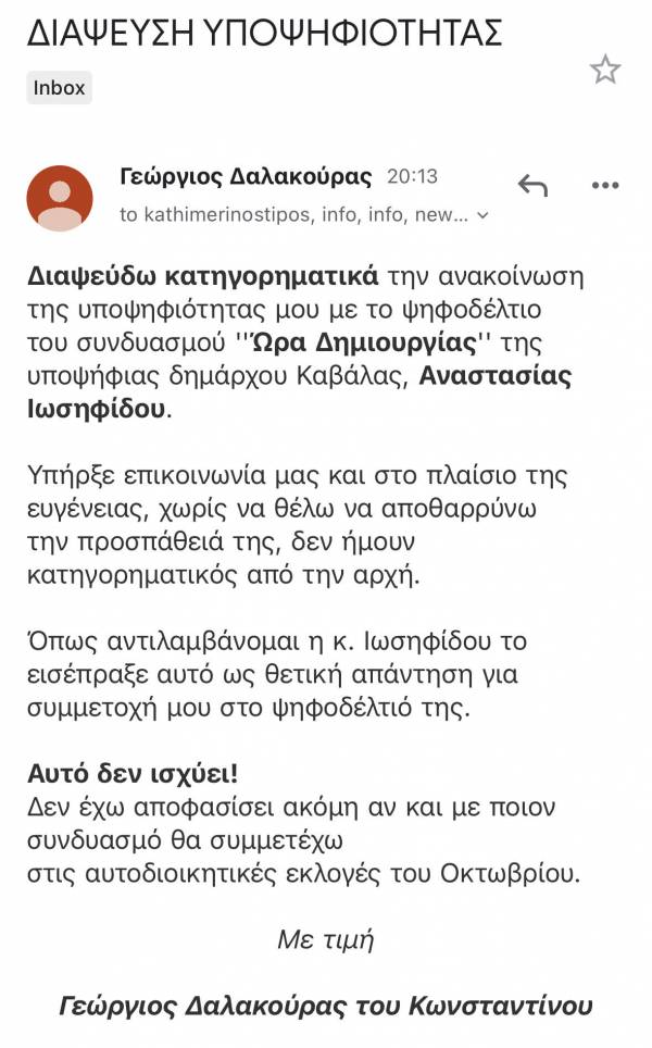 «Καθώς τις τελευταίες ώρες διακινήθηκε μέσω ηλεκτρονικού ταχυδρομείου προς τα ΜΜΕ, υποτιθέμενη επιστολή του Γεώργιου Δαλακούρα με την οποία δήλωνε δήθεν ότι δεν ισχύει η υποψηφιότητα του με την παράταξη «ΩΡΑ ΔΗΜΙΟΥΡΓΙΑΣ», σας προωθώ την από 10:30 μ.μ. διάψευση του ιδίου.