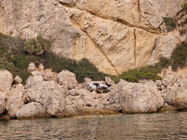 Το αυτοκίνητο βρίσκεται επάνω στα βράχια προκαλώντας την απορία των τουριστών που το βλέπουν από ψηλά.