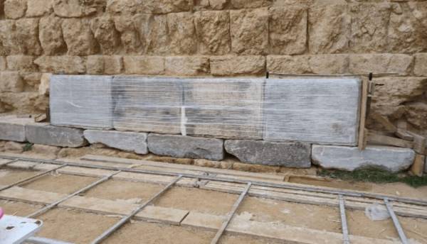 Για την στήριξη των μαρμάρινων μελών, έγιναν συμπληρώσεις με τεχνητό λίθο στις θραυσμένες ελλείπουσες μάζες των λιθοπλίνθων του πώρινου αντιθήματος και επαναχρησιμοποιήθηκαν οι τόρμοι και οι αύλακες των αρχαίων συνδέσμων.
