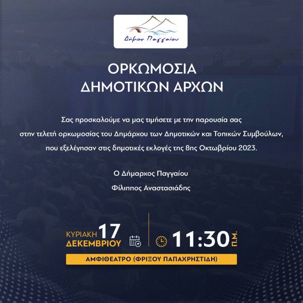 Την Κυριακή 17 Δεκεμβρίου και ώρα 11:30 το πρωί θα πραγματοποιηθεί η τελετή ορκωμοσίας του δημάρχου των δημοτικών και τοπικών συμβουλίων του Δήμου Παγγαίου, στο αμφιθέατρο Φρίξος Παπαχρηστίδης.