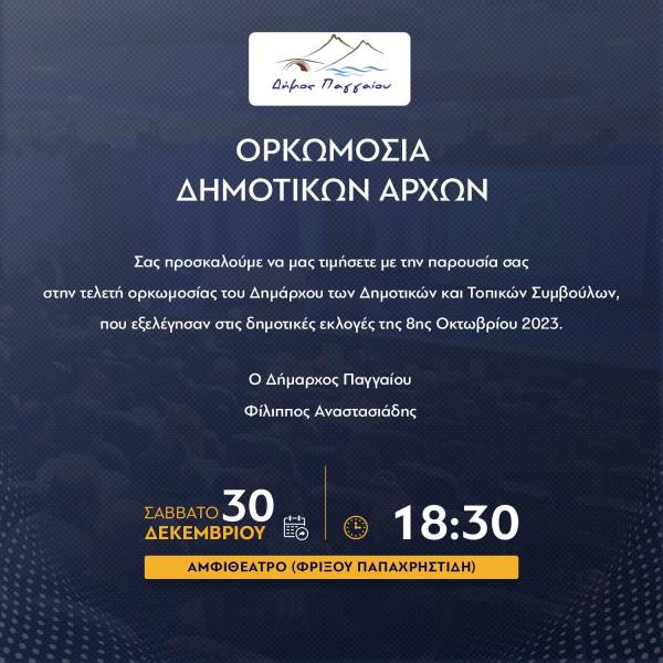 Για Σάββατο 30 Δεκεμβρίου προγραμματίστηκε η ορκωμοσία που επρόκειτο να γίνει την Κυριακή 17 Δεκεμβρίου 2023 και αναβλήθηκε αφού ο δήμαρχος, Φίλιππος Αναστασιάδης, νόσησε με κορωνοϊό.
