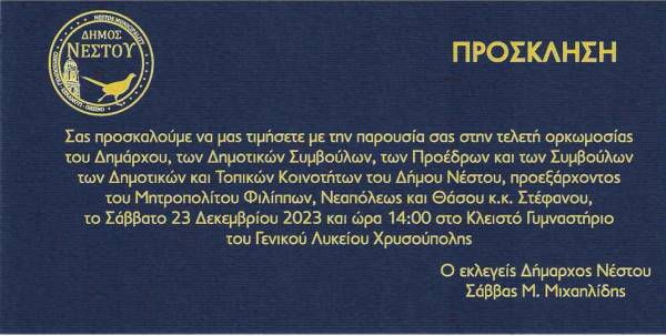 Σας προσκαλούμε να μας τιμήσετε με την παρουσία σας στην τελετή ορκωμοσίας του δημάρχου, των δημοτικών συμβούλων, των προέδρων και των συμβούλων των δημοτικών και τοπικών κοινοτήτων του Δήμου Νέστου, προεξάρχοντος του Μητροπολίτου Φιλίππων, Νεαπόλεως και Θάσου κ.κ. Στέφανου, το Σάββατο 23 Δεκεμβρίου 2023 και ώρα 14:00 στο κλειστό γυμναστήριο του Γενικού Λυκείου Χρυσούπολης.