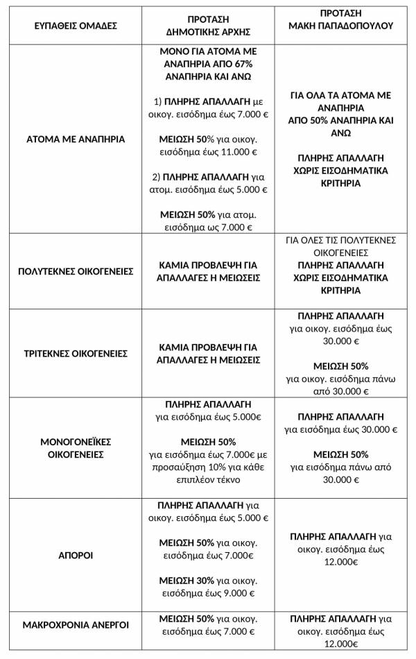 Γι΄ αυτό και εμείς προτείνουμε την πλήρη απαλλαγή από τα δημοτικά τέλη για τις περισσότερες ευπαθείς ομάδες, καθώς μάλιστα υπάρχει η δυνατότητα στη Δημοτική Αρχή να καλύψει το ποσό που θα προκύψει σε βάρος του προϋπολογισμού του Δήμου από τις απαλλαγές.