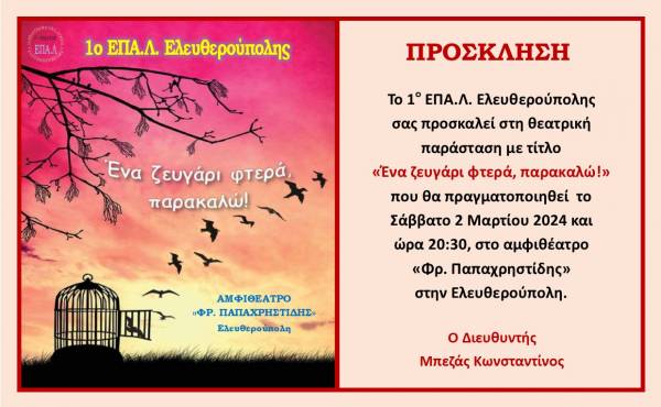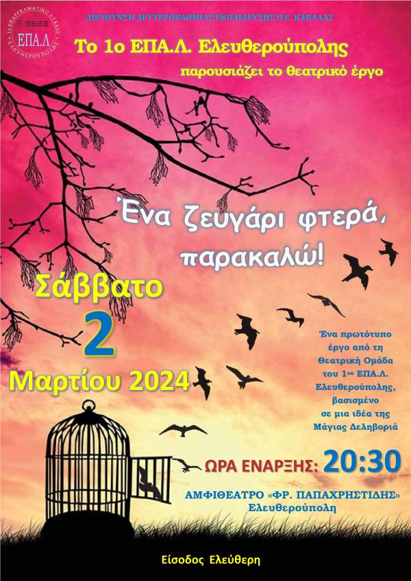 Το Σάββατο 2 Μαρτίου στις 20:30 στο αμφιθέατρο «Φρ. Παπαχρηστίδης» στην Ελευθερούπολη, το 1ο ΕΠΑΛ Ελευθερούπολης παρουσιάζει τη θεατρική παράσταση με τίτλο «Ένα ζευγάρι φτερά, παρακαλώ!».