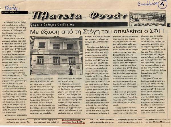 Ήταν οι ίδιοι και τότε (το 2011) όπως και τώρα που διακινούσαν «απόψεις» στον τοπικό τύπο, τις οποίες όμως αναγκάσθηκαν να ανακαλέσουν (άρον-άρον και εν όψει ευθυνών ποινικώς διωκομένων), με το ψευδεπίγραφο και τότε όπως και τώρα «σύνθημα» : -ΜΕ ΕΞΩΣΗ ΑΠΟ ΤΗΝ ΣΤΕΓΗ ΤΟΥ ΑΠΕΙΛΕΙΤΑΙ Ο ΣΦΓΤ-, και τους θέτω ενώπιον των όσων γι΄ αυτούς και τα γραφόμενα τους σημείωνε με πόνο ψυχής σε επίσημη αλληλογραφία με τον ΣΦΓΤ ο μακαριστός Προκόπιος : «… αποτελούν πλήρη διαστροφή των γεγονότων και της αληθείας, ανεπίτρεπτη σε ευαισθήτους πνευματικούς ανθρώπους των γραμμάτων και του πολιτισμού … κατά τρόπον υποβολιμαίον και σκόπιμον δημοσιεύεται στην -ΠΡΩΪΝΗ- της 2-5-2011 άρθρον με τίτλον : ΜΕ ΕΞΩΣΗ ΑΠΟ ΤΗΝ ΣΤΕΓΗ ΤΟΥ ΑΠΕΙΛΕΙΤΑΙ Ο ΣΦΓΤ, πλήρες ψευδολογιών και κακοηθειών, τις οποίες ο συντάκτης του χωρίς τίτλο την 5-5—2011 ανεκάλεσεν …». Τα αποκόμματα των εν λόγω δημοσιευμάτων, τα οποία αναγκάζομαι να θέσω στην δημοσιότητα, είναι αδιάψευστος μάρτυρας των πραγματικών διαθέσεων του καθενός, τα δε έργα του ο καθένας ημπορεί να τα ατενίζει και να καθρεφτίζεται σε αυτά όταν βρίσκει το θάρρος να αντιμετωπίσει την αλήθεια και μόνον.