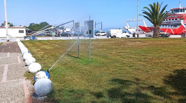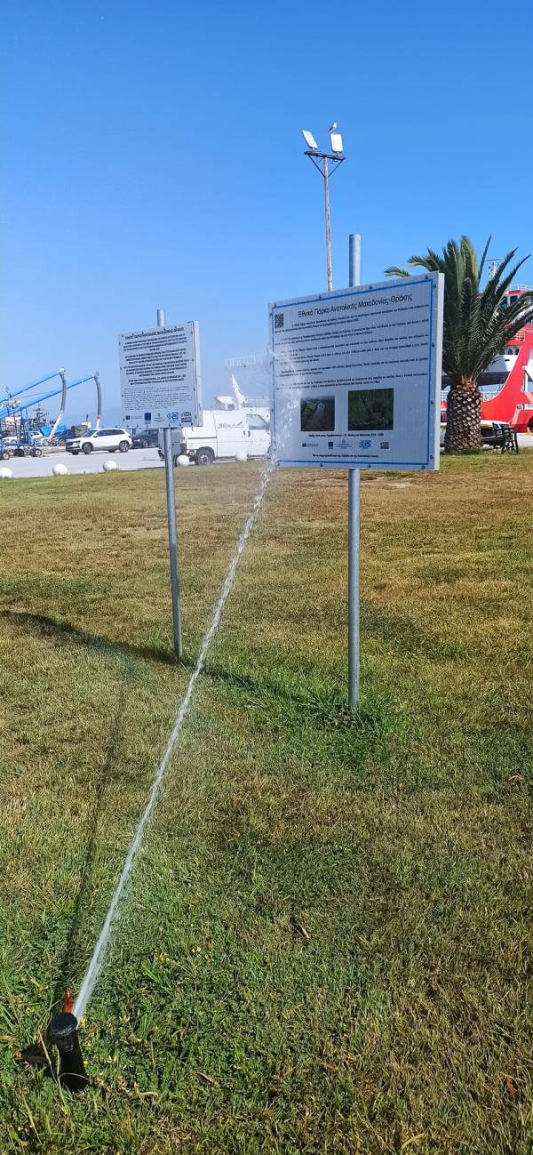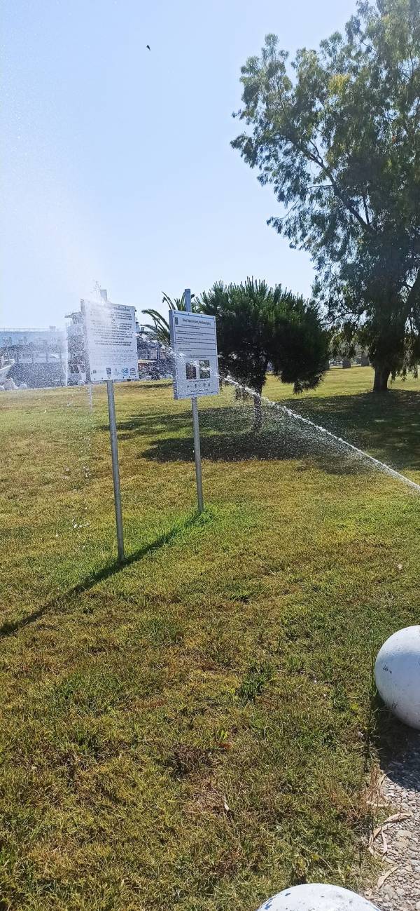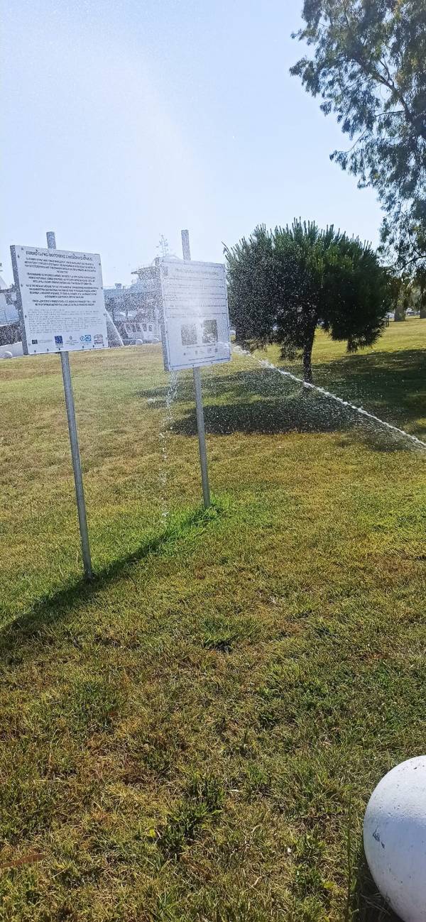 Όμως όπως φαίνεται στις παρακάτω φωτογραφίες, τα ποτιστικά συστήματα που υπάρχουν για να ποτίζουν το γρασίδι στο σημείο, αντί να ρίχνουν νερό στο γρασίδι, δροσίζουν… τις πινακίδες.