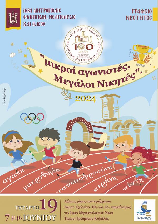 Εκδήλωση νεότητας διοργανώνει η ιερά Μητρόπολη Φίλιππων Νεαπόλεως και Θάσου την Τετάρτη, 19 Ιουνίου και ώρα 7 αύλειο χώρο του 12ου Δημοτικού Σχολείου Καβάλας.
