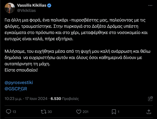 Ανάρτηση για τον τραυματισμό του πυροσβέστη έκανε στο X (πρώην Twitter) ο Υπουργός Κλιματικής Κρίσης και Πολιτικής Προστασίας, Βασίλης Κικίλιας.