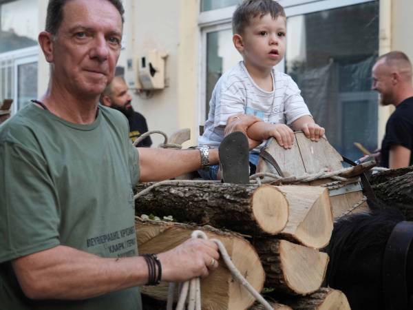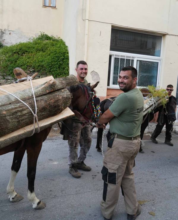 Το απόγευμα κατεβαίνουν με τα στολισμένα ζώα που είναι φορτωμένα με τα ξύλα και ακολουθεί γλέντι στην πλατεία του χωριού.