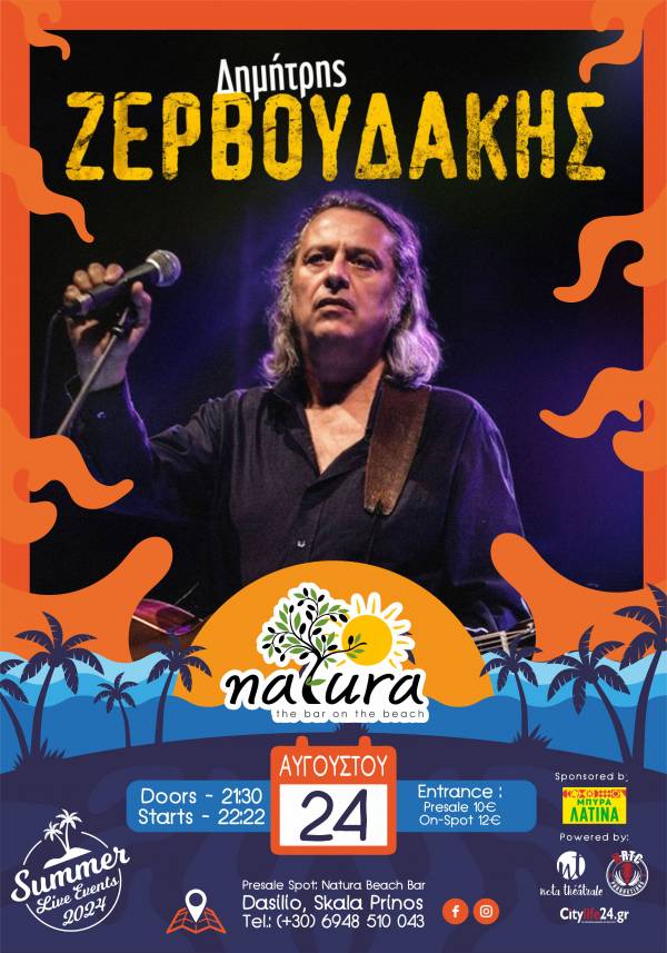 Ο Δημήτρης Ζερβουδάκης ζωντανά στη Θάσο Τρί, 20/08/2024 - 14:17 Ζωντανά στη Θάσο θα τραγουδήσει το Σάββατο 24 Αυγούστου ο Δημήτρης Ζερβουδάκης. Συγκεκριμένα, θα βρίσκεται στο Natura Beach Bar. Οι πόρτες ανοίγουν στις 21:30 ενώ η συναυλία ξεκινάει 22:22. Προπώληση: 10€ Είσοδος: 12€