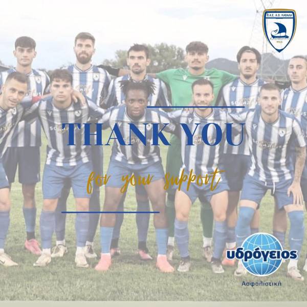 “Η ΠΑΕ ΑΟ Καβάλα ευχαριστεί την Υδρόγειο Ασφαλιστική για την στήριξη της στην φετινή προσπάθεια του συλλόγου μας στο πρωτάθλημα της Super League 2. Η πασίγνωστη ιδιωτική ελληνική ασφαλιστική εταιρεία, μεταξύ των μεγαλύτερων στον κλάδο των γενικών ασφαλειών της χώρας, η οποία δραστηριοποιείται στην Ελλάδα από το 1973 στέκεται δίπλα στην προσπάθεια μας, ενισχύοντας ακόμη περισσότερο τον σκοπό μας, ώστε ο σύλλογος μας να συνεχίσει να λειτουργεί σε άκρως επαγγελματικά πρότυπα συνεργαζόμενος με μεγάλες εταιρείες όπως είναι η Υδρόγειος. Με την βοήθεια σας συνεχίζουμε! Όλοι μαζί, για το έμβλημα, για την πόλη και για την ιστορία μας!”