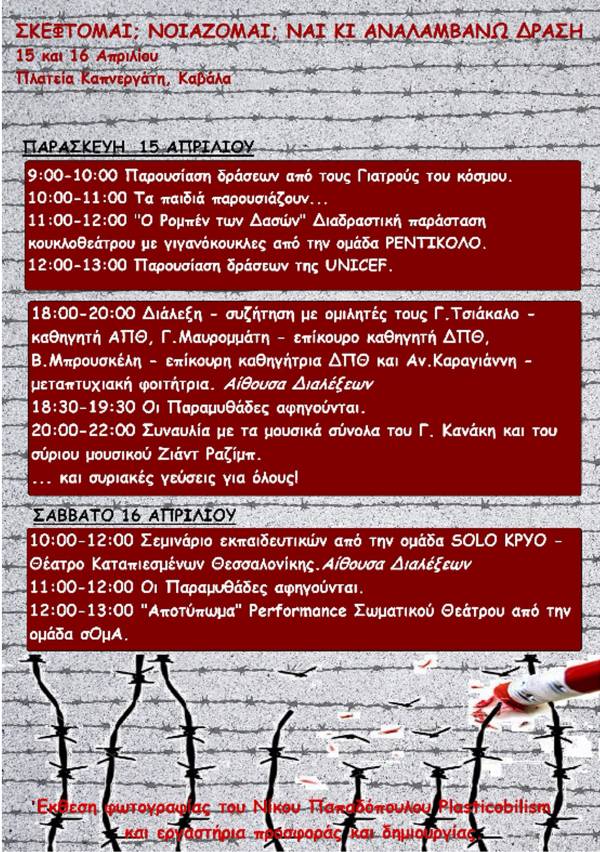 Η Διεύθυνση Πρωτοβάθμιας Εκπαίδευσης Καβάλας, ο Σύλλογος Εκπαιδευτικών Πρωτοβάθμιας Εκπαίδευσης Καβάλας, και ο Δήμος Καβάλας, σας καλούν να τιμήσετε με την παρουσία σας τη διήμερη εκδήλωση που συνδιοργανώνουν, με θέμα το προσφυγικό, για τις 15 και 16 Απριλίου 2016, στην πλατεία του Καπνεργάτη.