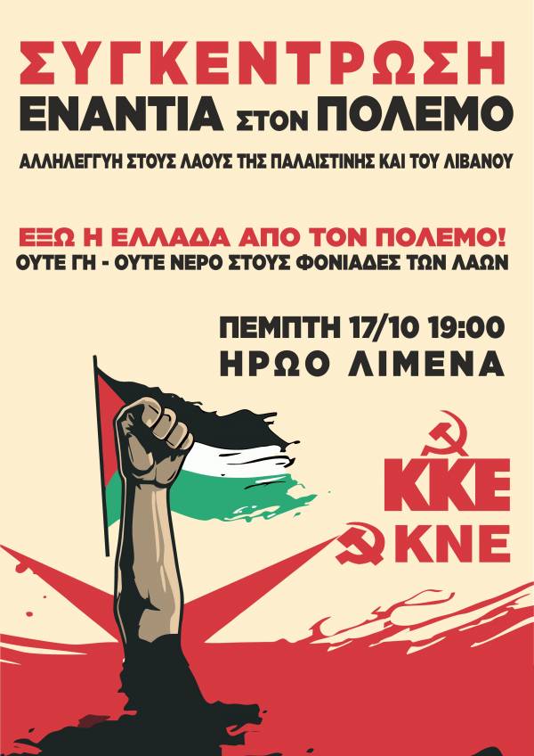 Συγκέντρωση ενάντια στον πόλεμο, αλληλεγγύη στους λαούς της Παλαιστίνης και του Λιβάνου διοργανώνει η ΚΝΕ και το ΚΚΕ Θάσου.