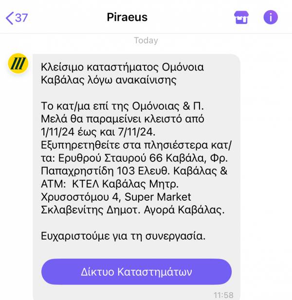 Κλειστό θα παραμείνει το κατάστημα στην οδό Ομόνοιας στο κέντρο της Καβάλας, για μια εβδομάδα, από τη 1 έως και τις 7 Νοεμβρίου 2024, λόγω ανακαίνισης.