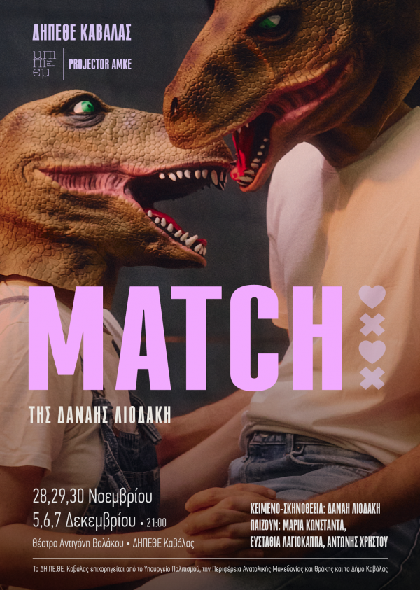 Το ΔΗΠΕΘΕ Καβάλας παρουσιάζει σε πανελλήνια πρώτη, το νέο θεατρικό έργο της Δανάης Λιοδάκη «Match» την Πέμπτη 28, την Παρασκευή 29, το Σάββατο 30 Νοεμβρίου και την Πέμπτη 5, την Παρασκευή 6 και το Σάββατο 7 Δεκεμβρίου 2024 στις 9 το βράδυ στο θέατρο Αντιγόνη Βαλάκου.