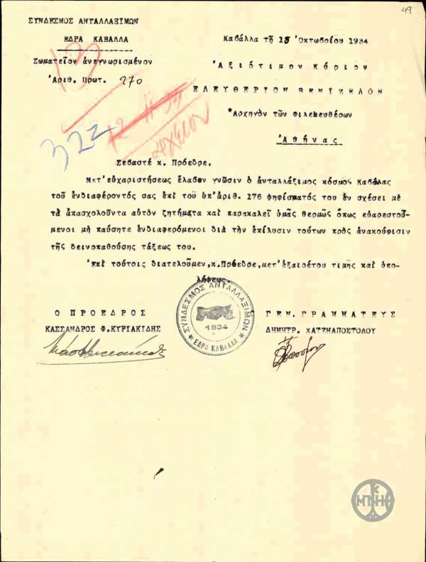 Έγγραφο, τον Οκτώβριο του 1934 του νεοσύστατου στην Καβάλα “Συνδέσμου Ανταλλαξίμων” που απευθύνεται στον αρχηγό των Φιλελευθέρων Ελευθέριο Βενιζέλου και τον ευχαριστεί για το ενδιαφέρον για τα προβλήματα των ανταλλαξίμων είχε προηγηθεί ψήφισμα του συνδέσμου.