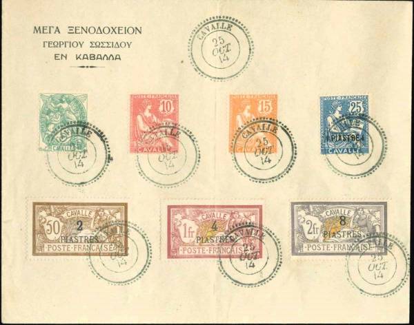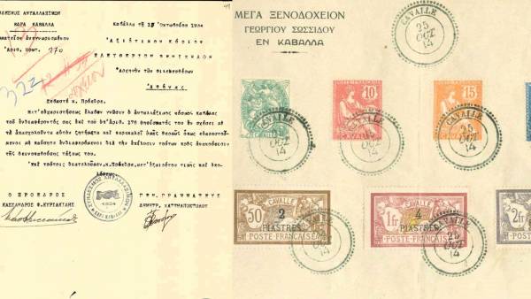 Καταστήματα, ξενοδοχεία Τράπεζες στην αρχή του περασμένου αιώνα στην Καβάλα μέσα από φακέλους και επιστολόχαρτα και με γραμματόσημα του Γαλλικού Ταχυδρομείου που είχε στην Καβάλα που εξέδωσε και ειδική σειρά γραμματοσήμων με την ονομασία “Cavalle”. Το “Μέγα Ξενοδοχείο” στην σημερινή οδό Ομονοίας.