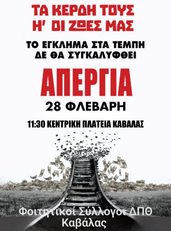 Συγκέντρωση διαμαρτυρίας για το δυστύχημα στα Τέμπη διοργανώνουν οι φορείς και οι σύλλογοι της Καβάλας στις 28/9, συμμετέχοντας στις πανελλαδικές κινητοποιήσεις.