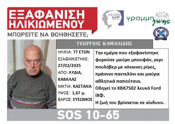 Ο Γεώργιος Καμαλίδης, 77 ετών, εξαφανίστηκε από το σπίτι του, στη Λυδία Καβάλας, το απόγευμα της 27/02/25, όταν έφυγε με το αυτοκίνητο του, ΙΧΦ, μάρκας Ford, χρώματος λευκού και με αριθμό κυκλοφορίας KBK7502, προς άγνωστη κατεύθυνση και για άγνωστη αιτία. Έκτοτε αγνοείται.