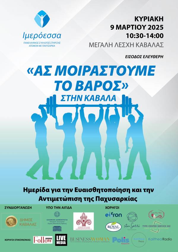 Ο Πανελλήνιος Σύλλογος Στήριξης Ατόμων με Παχυσαρκία “Ιμερόεσσα” σε συνεργασία με το Δήμο Καβάλας διοργανώνουν την Ημερίδα “Ας Μοιραστούμε το Βάρος” στην Καβάλα, την Κυριακή 9 Μαρτίου 2025 και ώρα 10:30 π.μ., στη Μεγάλη Λέσχη Καβάλας.