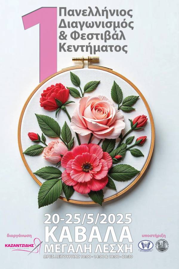 Το Κατάστημα Καζαντζίδης – Είδη Ραπτικής, με την υποστήριξη της εταιρείας Κλωσταί Πεταλούδα – Μουζάκης και του Λυκείου Ελληνίδων Καβάλας, διοργανώνει το 1ο Πανελλήνιο Φεστιβάλ Κεντήματος, συνοδευόμενο από διαγωνισμό χειροποίητων μετρητών κεντημάτων.