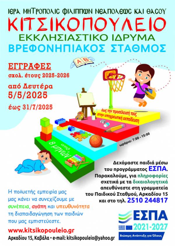 Aπό την Ιερά Μητρόπολη Φιλίππων, Νεαπόλεως και Θάσου ανακοινώνεται, ότι, εν όψει του νέου σχολικού έτους 2025-2026 η τοπική Εκκλησία φροντίζει για την διασφάλιση των απαραιτήτων προϋποθέσεων για την ομαλὴ λειτουργία του Εκκλησιαστικού Βρεφονηπιακού Σταθμού «Κιτσικοπούλειο» και την ασφαλή φιλοξενία βρεφών και νηπίων σε αυτόν.