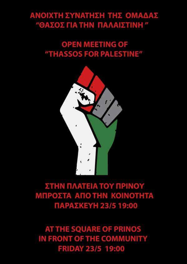Κάλεσμα απευθύνει η ομάδα "Θάσος για την Παλαιστίνη" σε όσους επιθυμούν να συμμετέχουν στην ευαισθητοποίηση και την ενημέρωση του κόσμου της Θάσου αλλά και των τουριστών αναφορικά με την Παλαιστίνη.