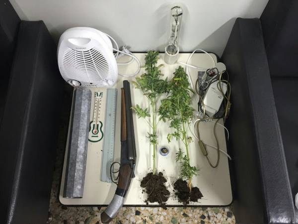 2 φυτά κάνναβης, ύψους 70 εκατοστών, τα οποία καλλιεργούσε σε ειδικά διαμορφωμένο χώρο, αποτελούμενο από ανεμιστήρα, λαμπτήρα φωτισμού, θερμόμετρο και χρονοδιακόπτη