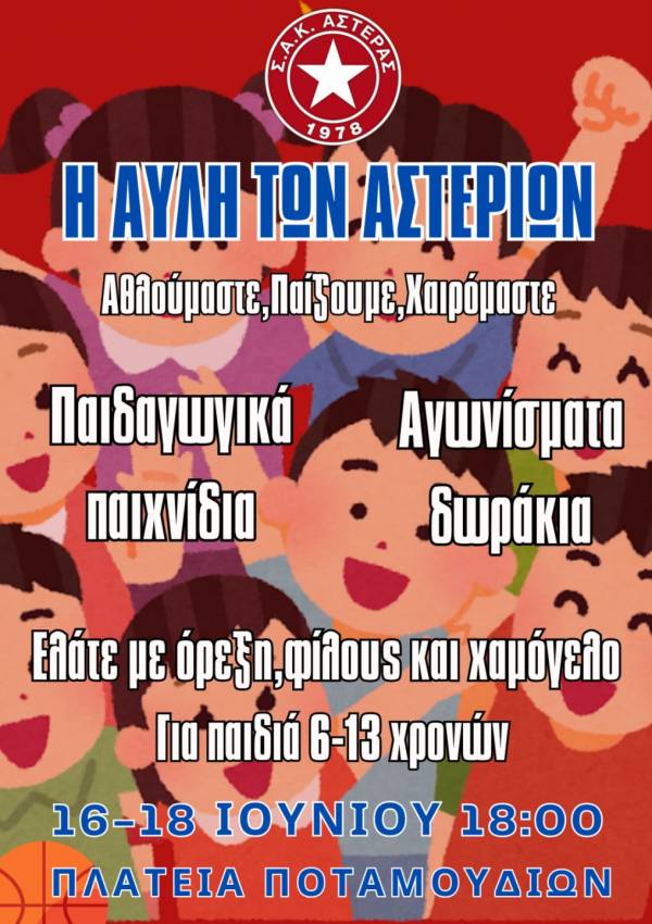 Ο Αστέρας Καβάλας διοργανώνει την εκδήλωση «Η Αυλή των Αστεριών», μια γιορτή για παιδιά ηλικίας 6 έως 13 ετών, γεμάτη αθλητισμό, παιχνίδι και δημιουργική απασχόληση.