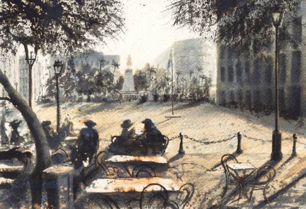 Μετά από μεθοδική έρευνα σε πλούσιο αρχειακό υλικό, καλλιτέχνης ανασυνθέτει με τη ζωγραφική του, την εποχή της δεκαετίας του 1940, μέσα από σημεία-ορόσημα της πόλης που περιγράφει ο συγγραφέας στην τετραλογία: θέατρα, καφενεία, παραλίες, εστιατόρια, δρόμους, πλατείες, ξενοδοχεία, μπαρμπέρικα, σπίτια, λιμάνια, σταθμούς τραίνων, καθώς και στιγμιότυπα των πρωταγωνιστών του έργου.