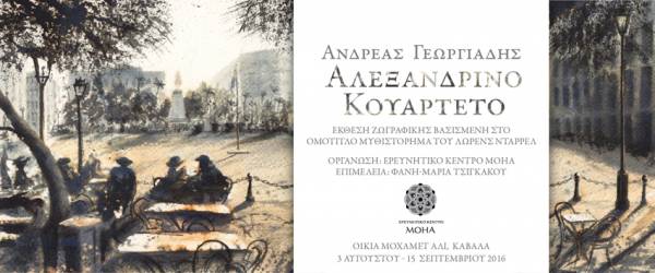 To Ερευνητικό Κέντρο MOHA παρουσιάζει στην Οικία Μοχάμετ Άλι στην Καβάλα, την έκθεση ζωγραφικής του ζωγράφου Ανδρέα Γεωργιάδη με τίτλο “Αλεξανδρινό Κουαρτέτο”, βασισμένη στην ομότιτλη τετραλογία του Λώρενς Ντάρρελ, σε επιμέλεια της Φανής-Μαρίας Τσιγκάκου.