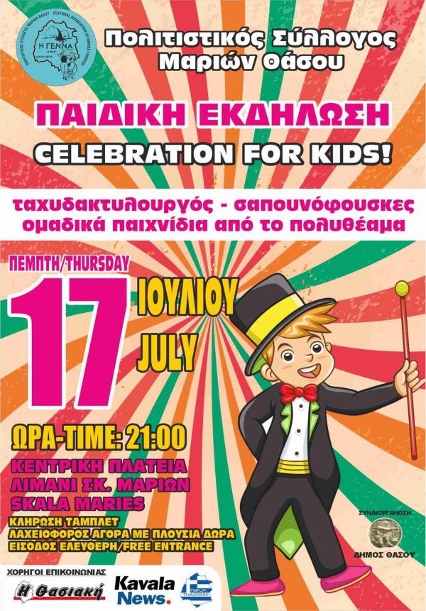 Ο Πολιτιστικός Σύλλογος Μαριών Θάσου διοργανώνει παιδική εκδήλωση με τίτλο Celebration for Kids!