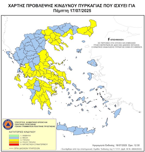 Σύμφωνα με τον χάρτη πρόβλεψης πυρκαγιάς του Υπουργείου Κλιματικής Κρίσης και Πολιτικής Προστασίας, η Καβάλα και η Θάσος βρίσκονται στο «κίτρινο» (κατηγορία 3), που σημαίνει «υψηλός» κίνδυνος.