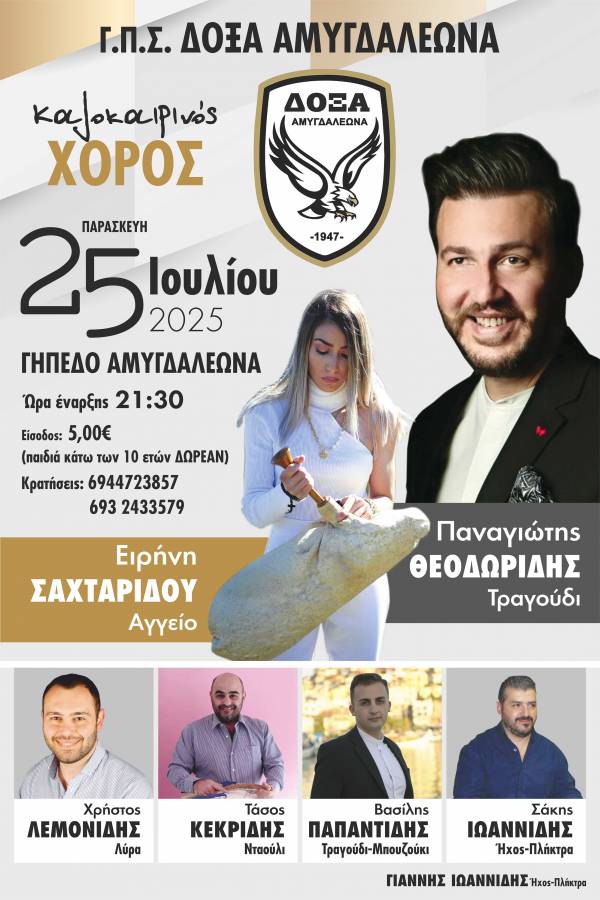 Ο Γ.Π.Σ. ΔΟΞΑ Αμυγδαλεώνα διοργανώνει τον μεγάλο καλοκαιρινό του χορό την Παρασκευή 25 Ιουλίου 2025, στο Γήπεδο Αμυγδαλεώνα, με ώρα έναρξης τις 21:30.