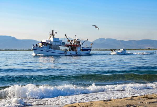 Βλέπουμε ένα καΐκι που βγήκε για ψάρεμα στην Κεραμωτή, ενώ πίσω του βλέπουμε ένα μικρότερο ψαροκάικο.