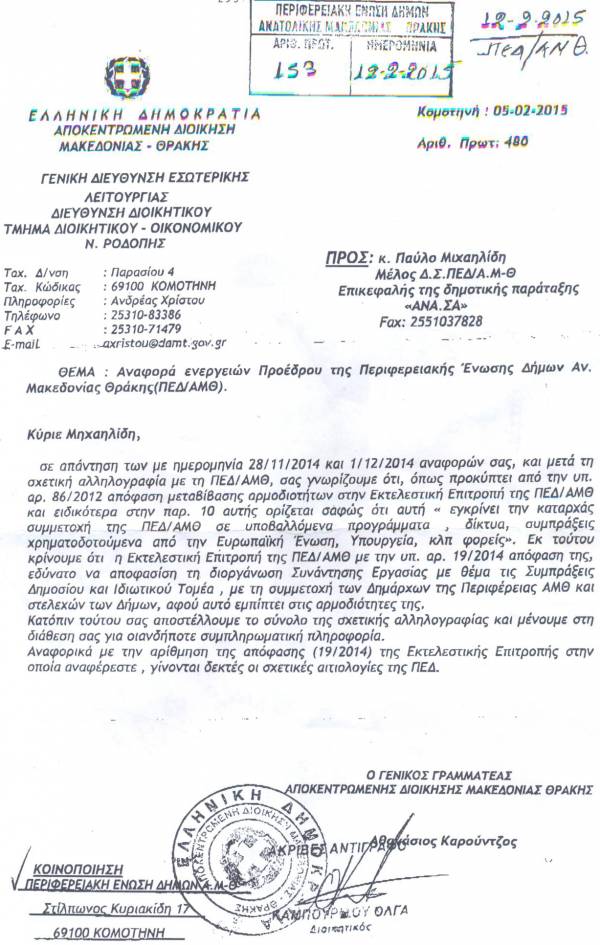 Μας κοινοποιήθηκε σήμερα Πέμπτη 12 Φεβρουαρίου 2015 το υπ΄αριθμ. 480/05-02-2015 έγγραφο - απάντηση της Αποκεντρωμένης Διοίκησης Μακεδονίας- Θράκης στην αναφορά του κ.Παύλου Μιχαηλίδη Μέλους του ΔΣ της ΠΕΔ ΑΜΘ, με την οποία αμφισβητούσε την νομιμότητα της λήψης απόφασης από την Εκτελεστική Επιτροπή για την διοργάνωση Συνάντησης Εργασίας.